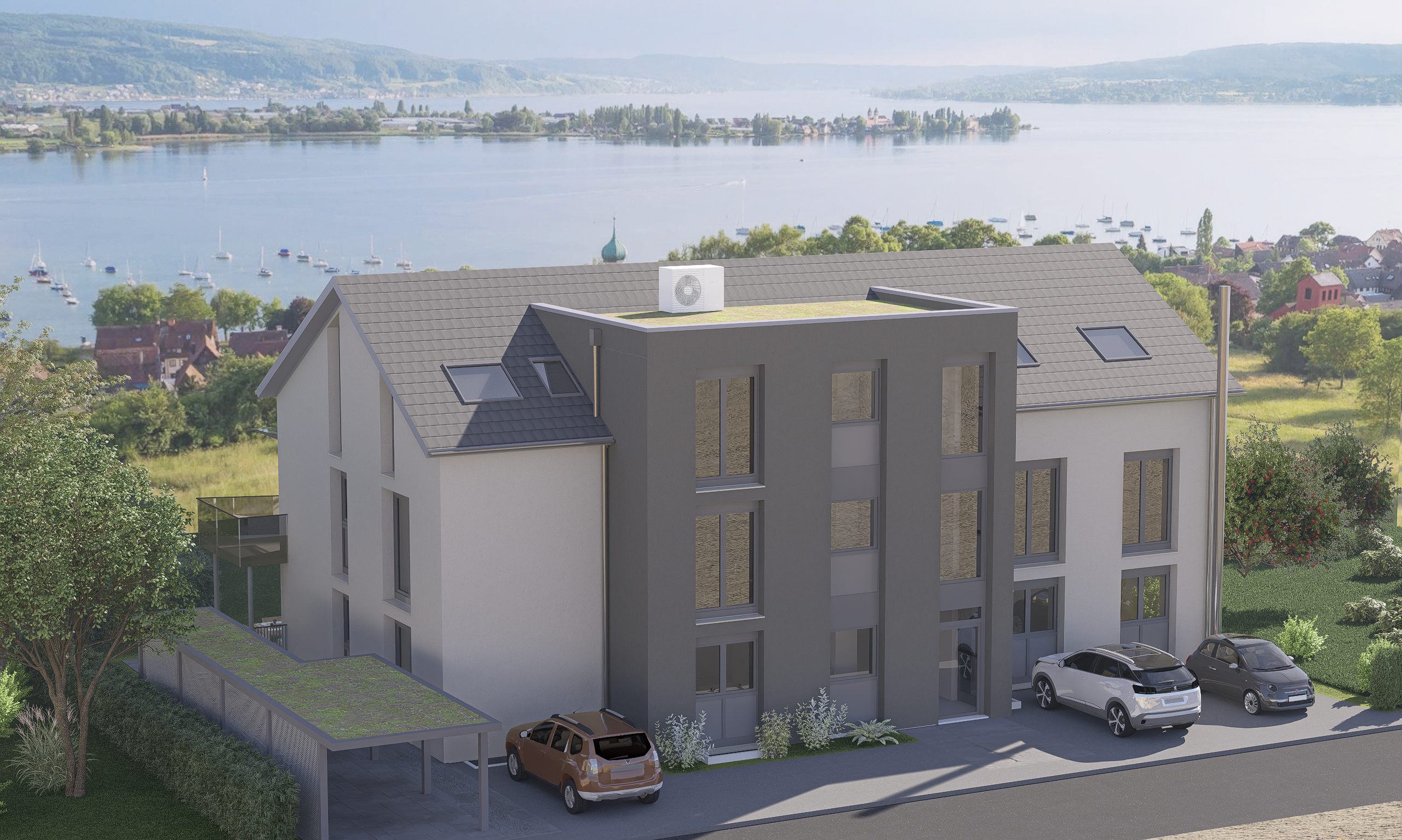In ruhiger, erhöhter Lage von Allensbach entstand dieses moderne 6-Familienhaus mit traumhaftem Blick auf den Bodensee, die Insel Reichenau und die Schweizer Alpen. Das Gebäude wurde im KfW-40-Standard errichtet und vereint durchdachte Grundrisse, hochwertige Ausstattung und ein nachhaltiges Heizsystem mit Luft-Wärmepumpe. Realisiert von HHP Architekten GmbH in Zusammenarbeit mit regionalen Handwerksbetrieben.